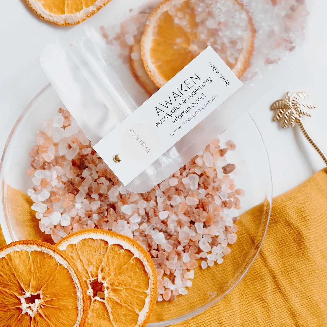 Awaken| Magnesium Sulfate (Epsom Salts), Pink Himalayan Rock Salts, Pure Eucalyptus Essential Oil, Pure Rosemary Essential Oil & Australian Grown Dried Orange Slices. Eucalyptus & rosemary vitamin boost