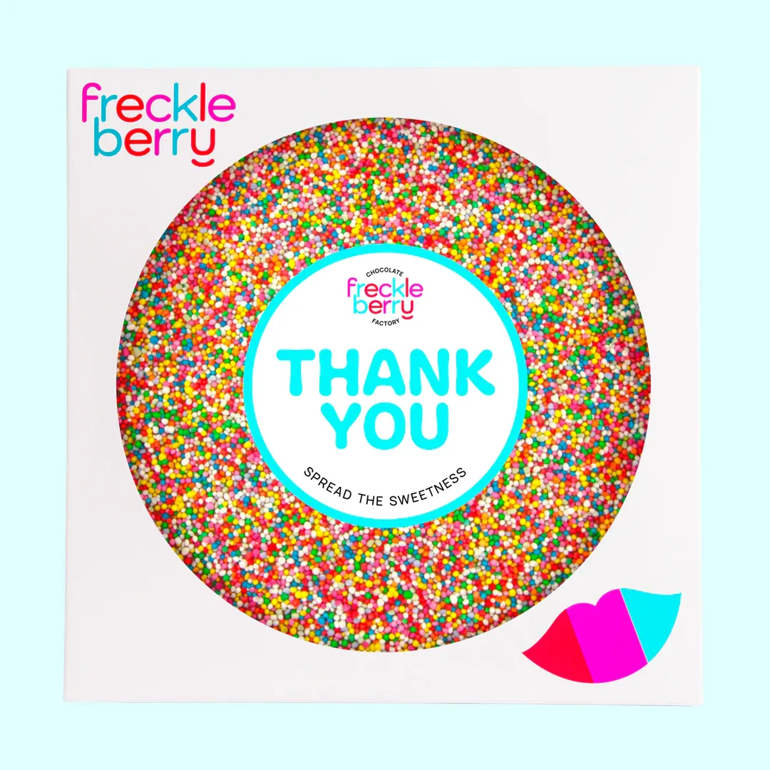 Freckle fans, this one is for you! Our giant handmade freckles are a real chocolate treat. Delicious creamy Belgium chocolate covered with thousands of coloured sprinkles. Yum! Weight 220g. Approx size: 18cm diameter.